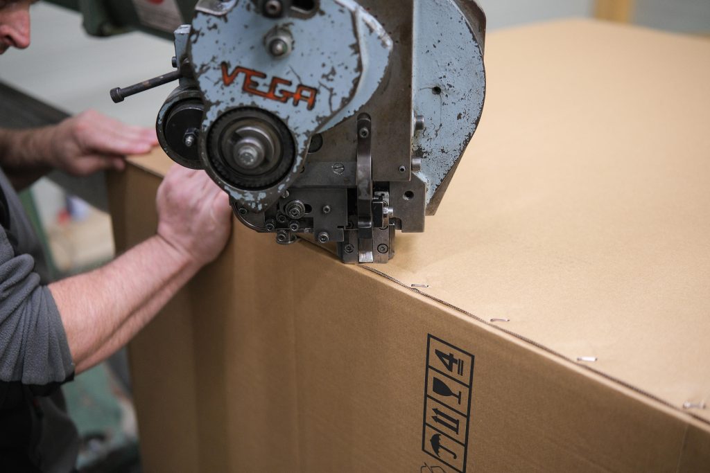 Šivanje izvajamo s profesionalnim šivalnim strojem za karton, ki uporablja kovinske sponke (žico) za spajanje robov škatle. Postopek je hiter, natančen in zagotavlja popolnoma poravnane robove, kar daje embalaži urejen in profesionalen videz.