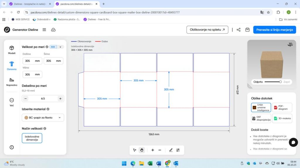 Da bi našo vizijo pretvorili v želeno obliko, v proces razvoja vključimo še en ključen korak: izdelavo fizičnega vzorca. S pomočjo natančnega CNC rezalnika hitro in učinkovito pripravimo delujoč prototip škatle. Ta fizični model je za našega kupca neprecenljiv, saj mu omogoči, da izdelek v rokah preizkusi, oceni njegovo obliko, trdnost in funkcionalnost, še preden se odloči o končni izvedbi. Skupaj z naročnikom nato vzorec dopolnjujemo in prilagajamo, dokler ne dosežemo popolnega odziva in zadovoljstva.